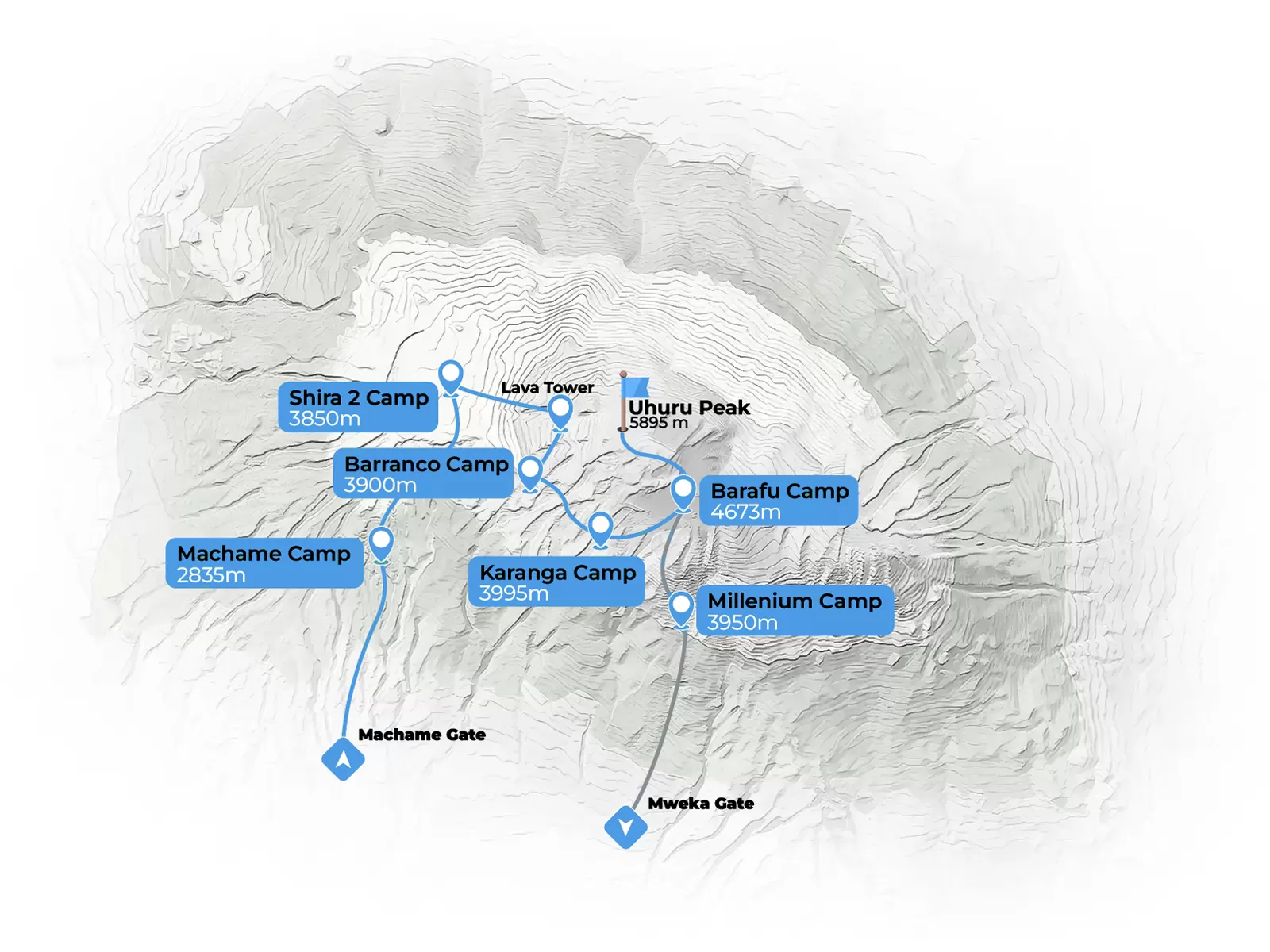 The Machame route is scenically beautiful and varied. However, due to its popularity there are increased numbers of trekkers, it loses some of its splendour. The Machame route approaches the summit from the southwest and descends using the Mweka route, rewarding climbers with views of the expansive Shira Plateau, an optional scramble up Lava Tower, a climb up the Great Barranco wall, and a traverse underneath Kilimanjaro’s southern ice field. In certain sections this route is steeper than the Marangu and Rongai routes and physically more demanding but is easier overall.